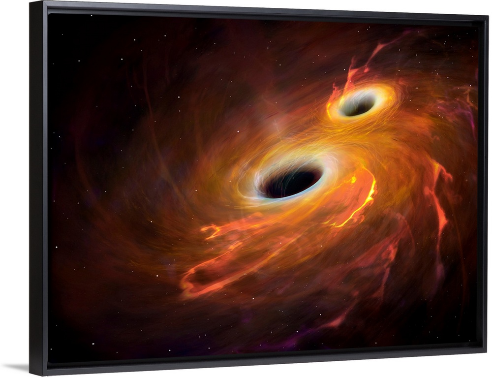 <p>Illustration of two black holes orbiting each other in a combined accretion disc. Eventually the black holes will merge, an event that will produce gravitational waves. Gravity is the distortion of space-time by mass, and changes in this distortion travel in waves at the speed of light. The effect is most pronounced where extremely massive objects are subject to extremely high acceleration. This is seen, for instance, where black holes or neutron stars are in a close orbit such as this. In February 2016, gravitational waves were detected for the first time, 100 years after Einsteins prediction. The waves emanated from the collision of two black holes, of 36 and 29 solar masses, some 1.3 billion light years away. The waves were extremely faint by the time they arrived at Earth, where they were detected by the two LIGO detectors in the USA.</p>