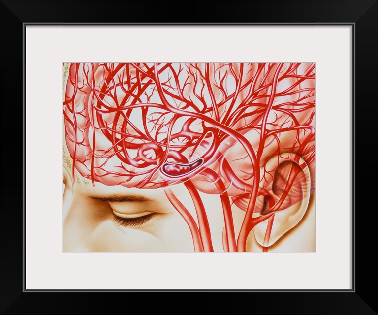 <p>Cerebral embolism. Artwork of the blood supply to the head showing an embolism (blockage) in the cerebral artery, a cause of stroke. The embolism (illustrated at lower centre) is usually caused by a blood clot and results in the interruption of the blood supply to part of the brain. A stroke is the damage caused to part of the brain by this interruption in blood supply. Sensation, movement, or function controlled by the damaged area is impaired. Strokes can be fatal and are a leading cause of death in developed countries.</p>
