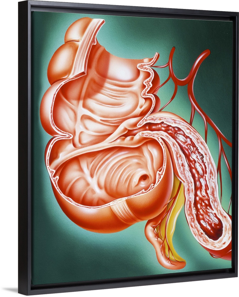 <p>Crohn's disease. Artwork of a section through part of the human digestive tract, showing the small intestine affected by Crohn's disease, or regional enteritis. The small intestine (at lower right), meets the large intestine (colon, at left) at centre. Between them lies the appendix (at lower centre). Crohn's disease often occurs in the last section of the small intestine, the terminal ileum. The disease produces inflammation (red) and abscesses (white) on the wall of the small intestine. Symptoms include diarrhoea, abdominal pain, loss of appetite and anaemia. The causes are unknown. Treatment includes corticosteroid drugs and sometimes surgery.</p>