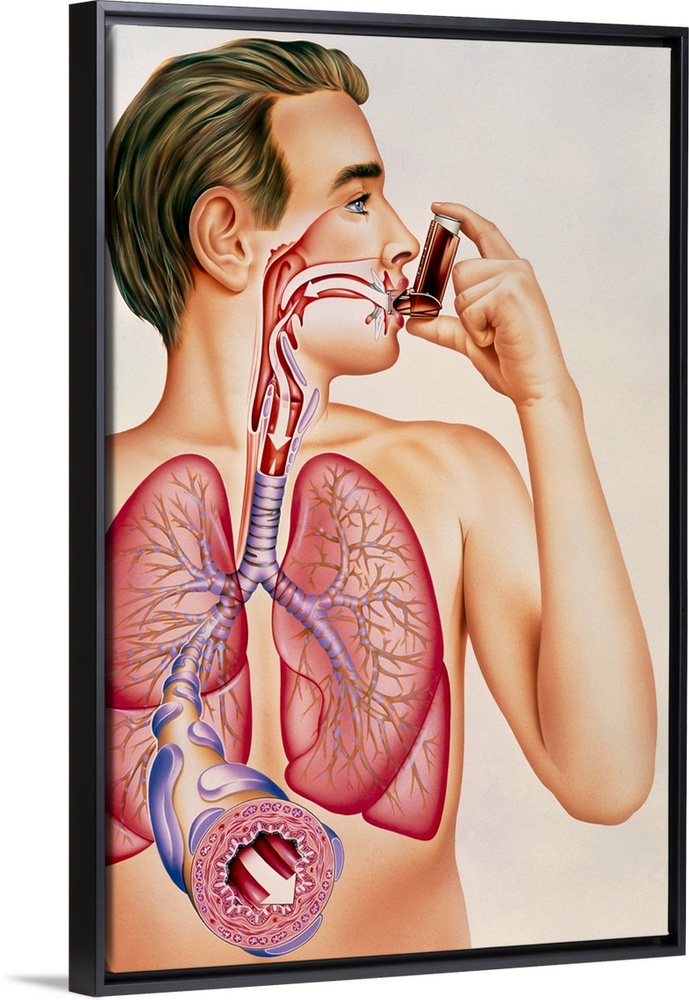 <p>Asthma inhaler. Artwork showing the effects of an asthma inhaler containing bronchodilator drugs on the lungs of a man. Bronchodilator drugs work by widening the airways (the bronchioles) of the lungs. This effect is illustrated by the enlarged bronchiole at lower left. During an asthma attack, bronchioles become narrow following contraction of the muscle layer and swelling of the mucous lining. This leads to impaired breathing. Bronchodilator drugs act on the nerve signals that govern muscle activity in the bronchioles, thereby relaxing the muscles and restoring normal breathing.</p>