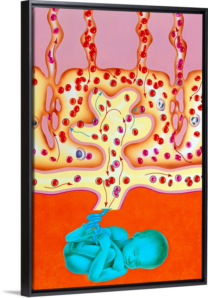 <p>Placenta. Illustration of blood flow through a hu- man placenta, showing a foetus next to a diagram of red blood cells flowing through part of the placenta. The irregular structure at centre is a chorionic villus - a projection of foetal tissue into the maternal part of the placenta. Deoxygena- ted blood (purple cells) from the foetus flows through this, and picks up oxygen from the nearby maternal blood. Arrows show direction of flow. The red cells are oxygenated. Some of the foetal blood cells (blue outline) have passed through the mem- brane into the maternal bloodstream. This can cause haemolytic disease if the mother is rhesus negative when the baby is rhesus positive.</p>