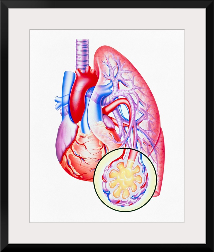 <p>Lung oedema in heart failure. Illustration showing leakage of fluid (oedema) into the lung due to heart failure. A magnified circle shows one of the lung's air sacs filled with fluid. The large red vessel is the aorta, the main artery taking blood from the heart to the body. To its left is the vena cava (blue), which brings blood back. To its right is the pulmonary artery (blue), which takes blood to the lungs. At top left is the windpipe, shown leading to airways in the lung. Heart fail- ure is when the heart fails to empty itself fully with each beat, causing a backflow of pressure ag- ainst the pulmonary vein. This results in fluid leaking into the lungs, with symptoms like asthma.</p>