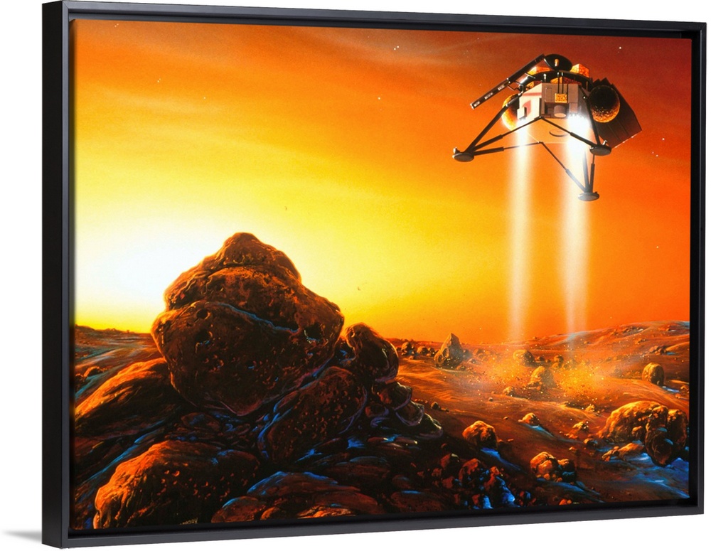 <p>Mars Polar Lander. Artwork of the Mars Polar Lander about to land in the South Polar region of Mars. The probe is due for launch in January 1999. Some carbon dioxide frost is seen in the shade of the boulders. This lightweight spacecraft is designed to study the soil and weather on Mars. It also has several imaging systems which will be used to photograph the terrain. A robot arm will be used to collect soil samples for on-board analysis. These will be tested for water, which will provide clues about possible Martian life in the planet's warmer, more hospitable past.</p>