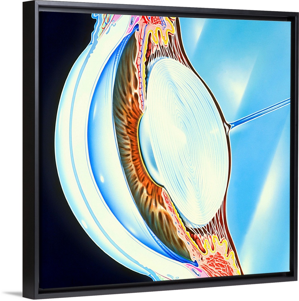 <p>Eye. Artwork of the front (anterior) part of a human eyeball. The eye is the organ of sight. Most of the focusing of light is done by the cornea (white, centre left). The light passes through the pupil, a hole in the iris (brown), and is further focused by the lens (centre). Light falls on the retina (not seen) which relays information to the brain. The iris can expand and contract to alter the amount of light entering the eye. The lens is held in place by thin fibres known as zonule fibres, which extend from the ciliary body (pink, top left and bottom right) surrounding the iris. The channel running from the lens to upper right is the hyaloid canal.</p>