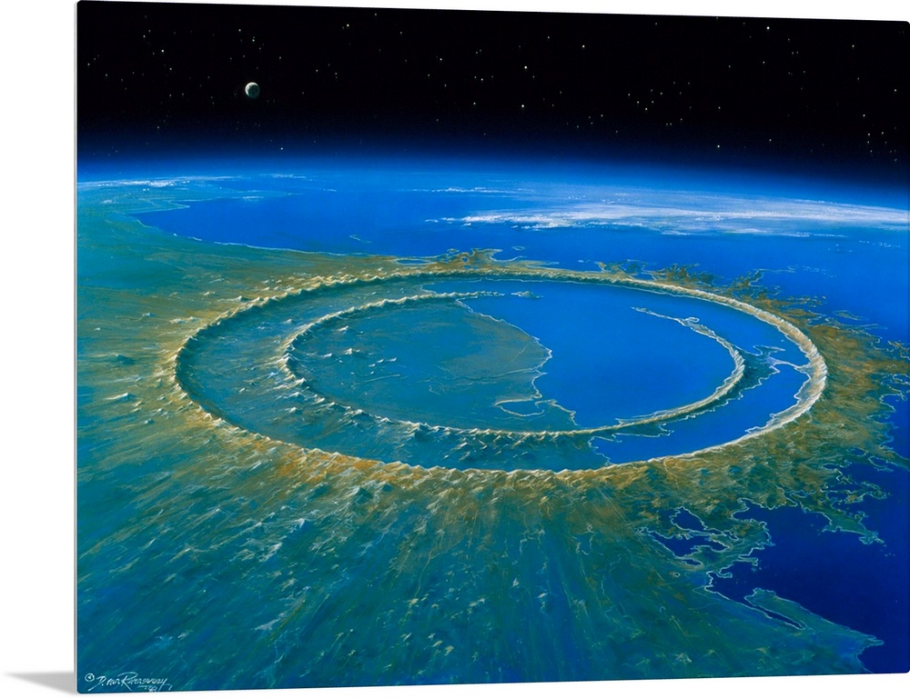 <p>Chicxulub crater. Artwork of the Chicxulub impact crater on the Yucatan Peninsula, Mexico, soon after its creation. This impact may have caused the extinction of the dinosaurs and 70 of all Earth's species 65 million years ago. The crater is about 180 kilometres (km) wide and was caused by an asteroid or comet core which was 10-20 km across. The impact threw trillions of tonnes of dust into the atmosphere which may have blocked the Sun's light and caused global climate changes. The remains of this debris are found worldwide as a layer in rocks known as the \K/T boundary\. Other impacts like this in Earth's future are a statistical certainty.</p>