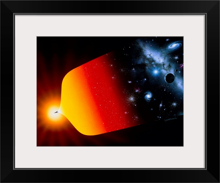<p>Universe history. Artwork showing the history of the Universe, from its creation (Big Bang), to the present (upper right). Time began about 15 billion years ago when a huge explosion created all the universe's mass at a single point (black). The uni- verse grew rapidly (inflation) in the first thous- and billionth of a second (widening yellow area). It then expanded more slowly and cooled, allowing nucleon particles (orange) to form at one hundred thousandth of a second. Some of these combined to form atomic nuclei at 100 seconds (dark orange) which then formed stars. At 300,000 years (black) the universe became transparent to the background radiation left over from the Big Bang.</p>