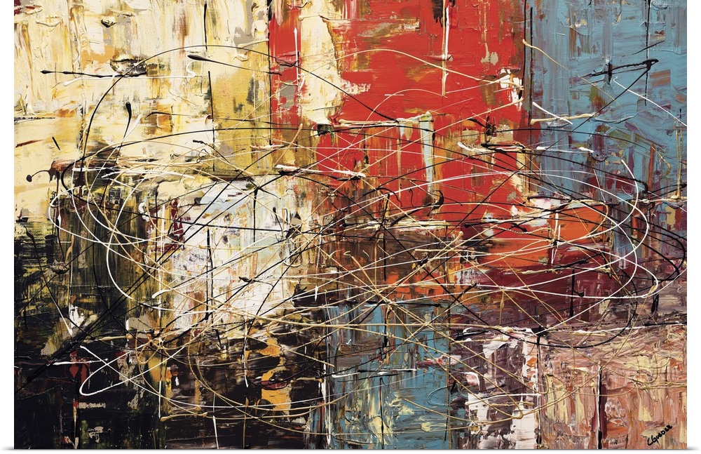 <p>Large abstract painting with sections of blue, red, cream, yellow, white, and black and thin black, white, and gold squiggly lines on top.</p>