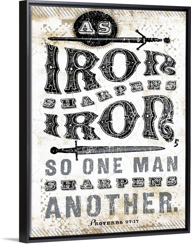 <p>Distressed lettering of the scripture bible verse Proverbs 27:17 As iron sharpens iron, so one man sharpens another</p>