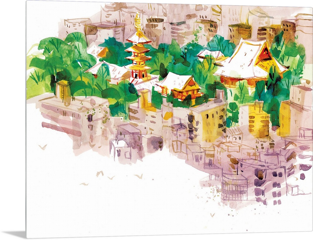 <p>Watercolor illustration of Senso-ji Temple in Asakusa, Tokyo, seen from above. Captured from life from the Asahi building August 2018.</p>