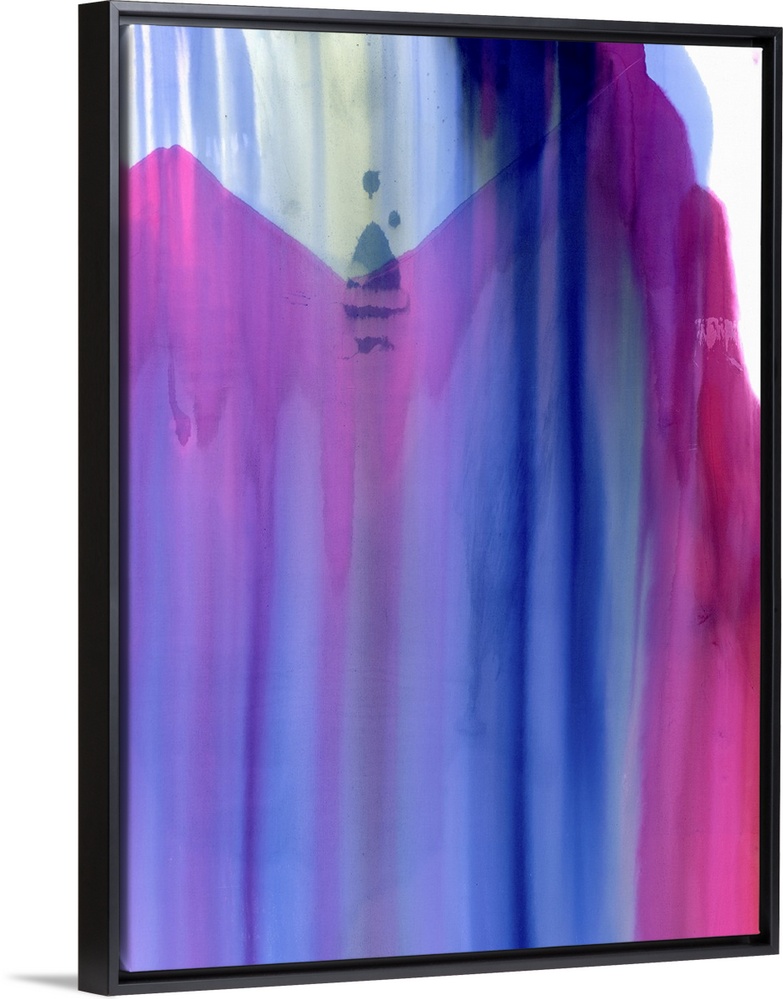 <p>A contemporary abstract painting of almost transparent purple and pink fluid cascading down over pale blue and green tones against a white.</p>