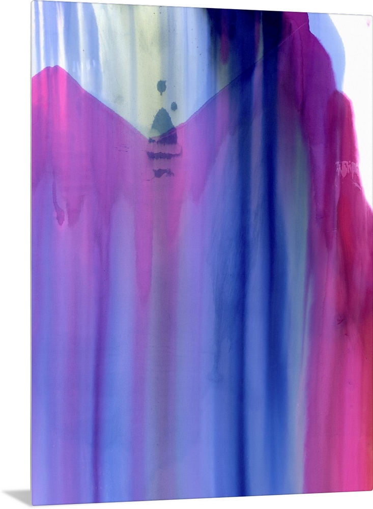 <p>A contemporary abstract painting of almost transparent purple and pink fluid cascading down over pale blue and green tones against a white.</p>