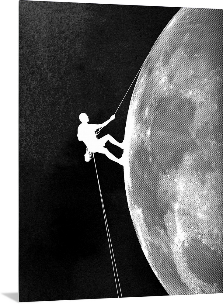 <p>Contemporary artwork in black and white of a climber shown descending down the side of the moon.</p>