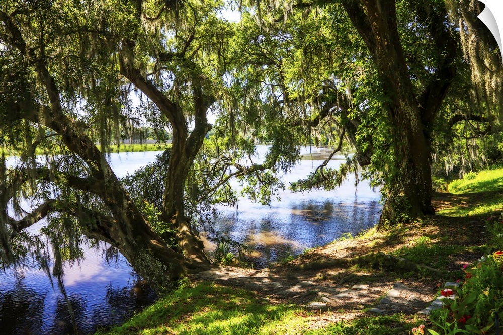<p>Landscape photograph of the Ashley River bank lined with large trees on a sunny day.</p>