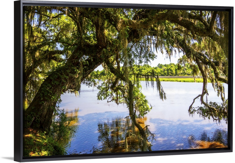 <p>Landscape photograph of a Water Oak tree covered in Spanish Moss leaning over the bank of the Ashley River, SC.</p>