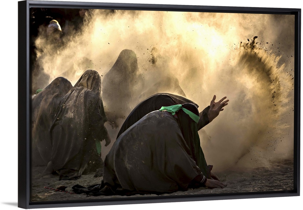 <p>A group of people bending down and tossing dust into the air, iran.</p>