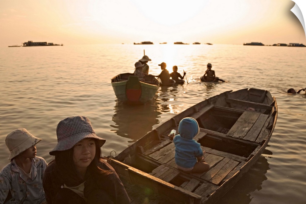 <p>Cambodia, Kampuchea, Siemreab, Siem Reap, Children on boat at floating Village of Chong Kneas, TONLE SAP LAKE</p>