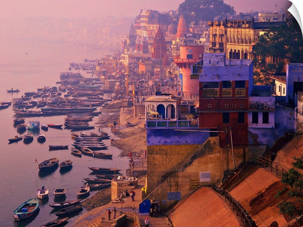 <p>I ghat lungo il Gange a Varanasi (Benares), emergono dalla nebbia alle prime luci dell'alba.</p>