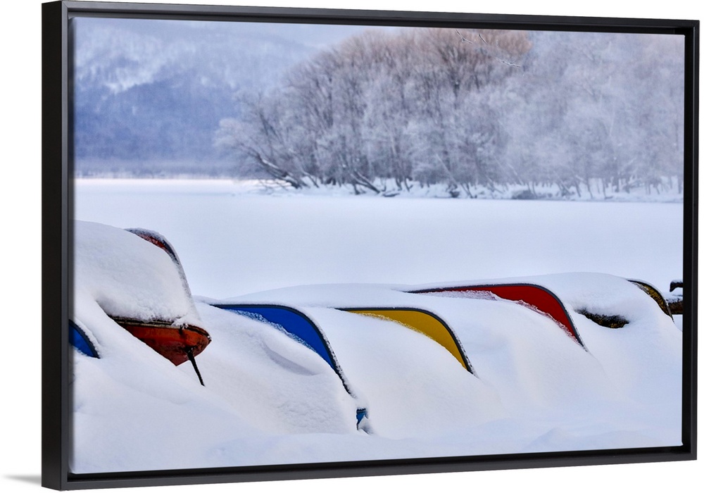 <p>Asia, Japan, Hokkaido, Lake Kussharo, Colorful Canoes in the Snow</p>