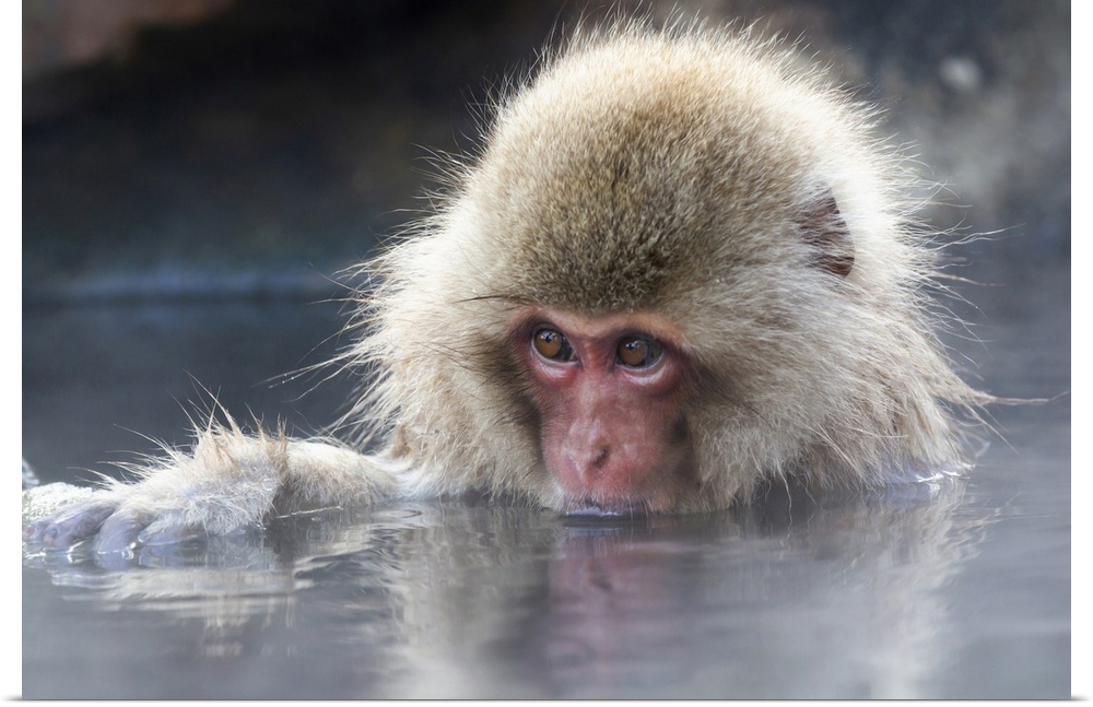 <p>Asia, Japan, Nagano, Jigokudani Yaen Koen, snow monkey park, Japanese macaque, Macaca Fuscata. Portrait of a juvenile snow monkey soaking in the thermal pool.</p>