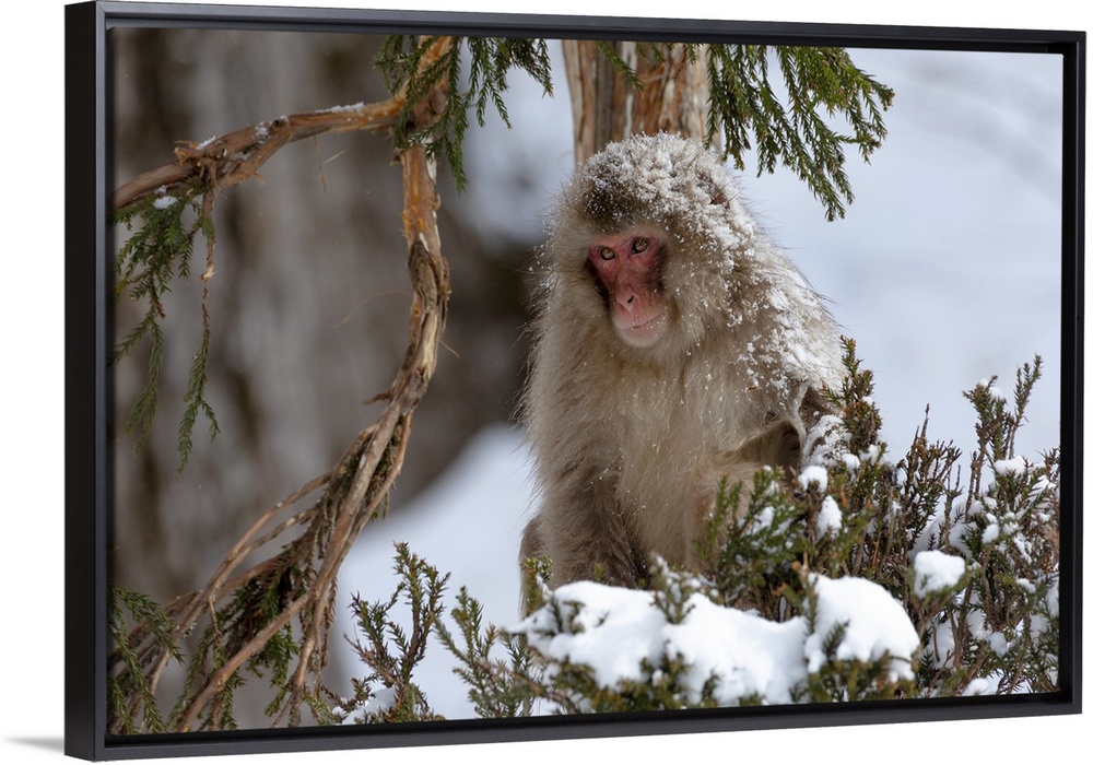 <p>Asia, Japan, Nagano, Jigokudani Yaen Koen, snow monkey park, Japanese macaque, Macaca Fuscata. An adult Japanese snow monkey sits in a cedar tree.</p>