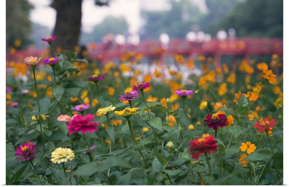 <p>Vietnam, Viet nam, Hanoi, Flower bed and Huc Bridge, Hoan Kiem Lake</p>