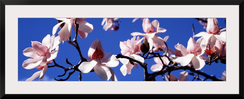 <p>Panoramic photograph taken of a branch of magnolia blossoms against a clear blue sky.</p>