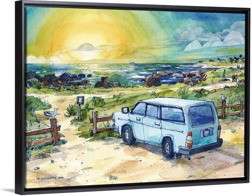 <p>A charming blue Volvo parked at the entrance to a little state park in Monterey Bay, California. Can you hear the waves? This artwork was originally created with ink and watercolor.</p>