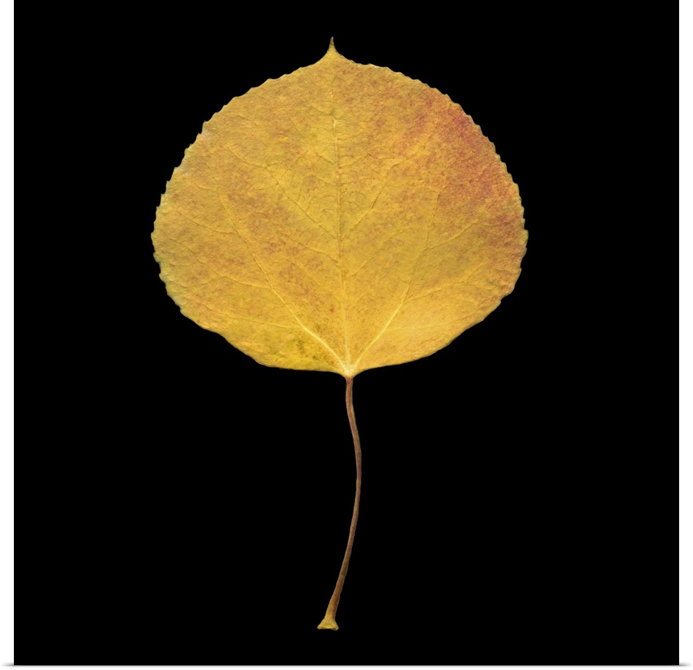 <p>Square, large wall hanging of a single golden aspen leaf on a solid black background.</p>