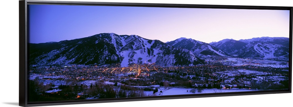 <p>Long panoramic photo of Aspen Colorado at dust nestled in the valley of the snow covered mountains.</p>