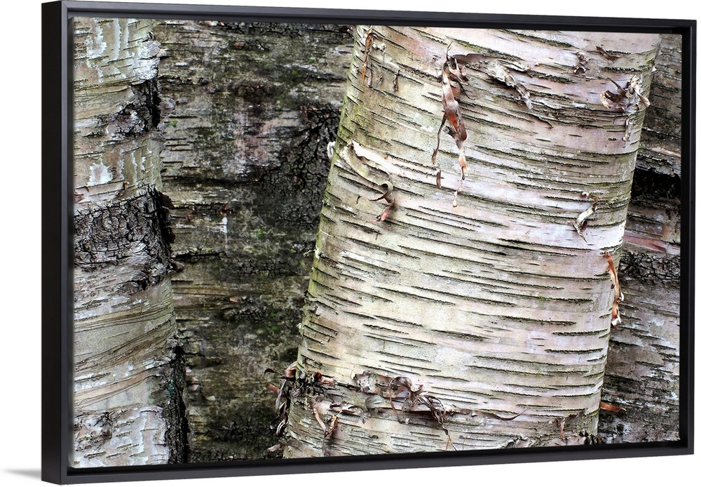 <p>Giant photograph focuses on the rough and distressed texture of bark on a set of trees.</p>