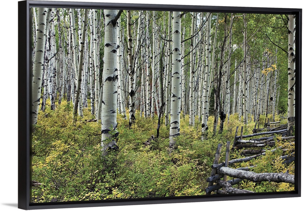 <p>Grove of aspen trees in a forest with a hand build fence cutting through the bottom brush.</p>
