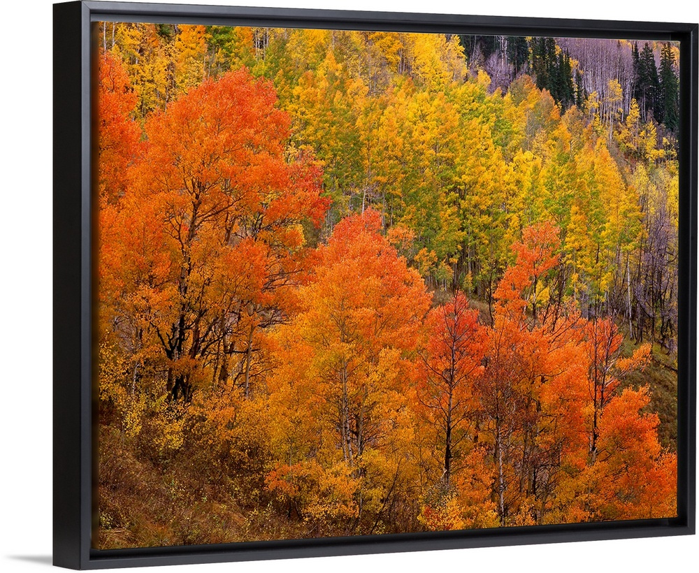 <p>Landscape photograph on a big wall hanging of bright fall colored trees sloped along a hillside in Gunnison National Forest in Colorado.</p>
