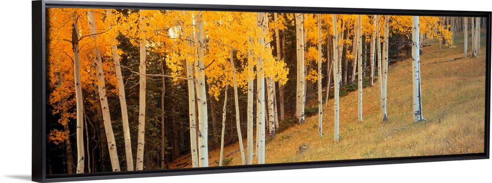 <p>Panoramic photograph shows a forest of scattered trees sitting on the side of a hill.</p>
