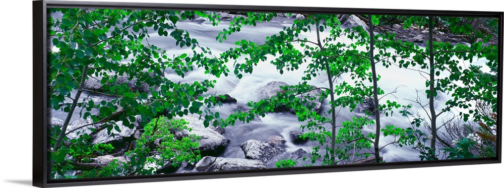 <p>Aspen line the bank along the outlet from String Lake, Grand Teton National Park, Wyoming, USA.</p>