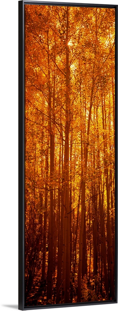 <p>Giant, vertical photograph of tall aspen trees in the fall, a golden sunrise behind them, in Colorado.</p>