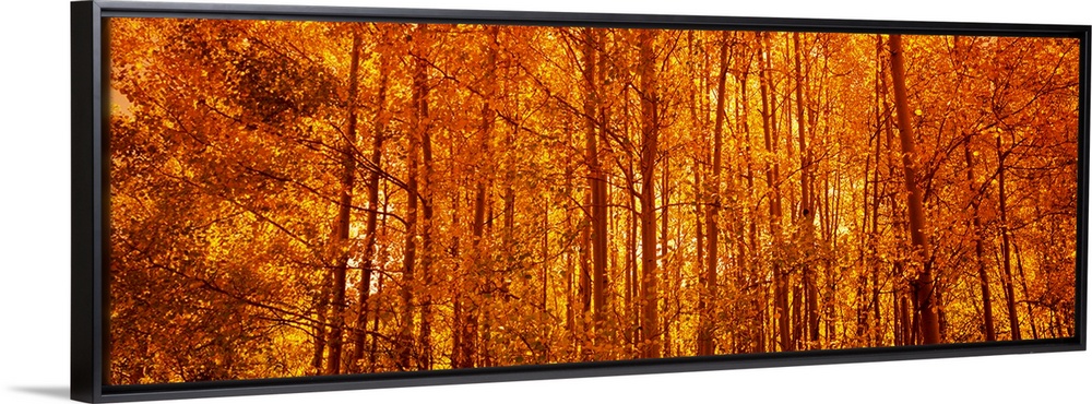 <p>Giant, panoramic photograph of a dense forest of aspen trees with fall foliage. The sun rising through the trees gives the image a fiery, golden tone.</p>