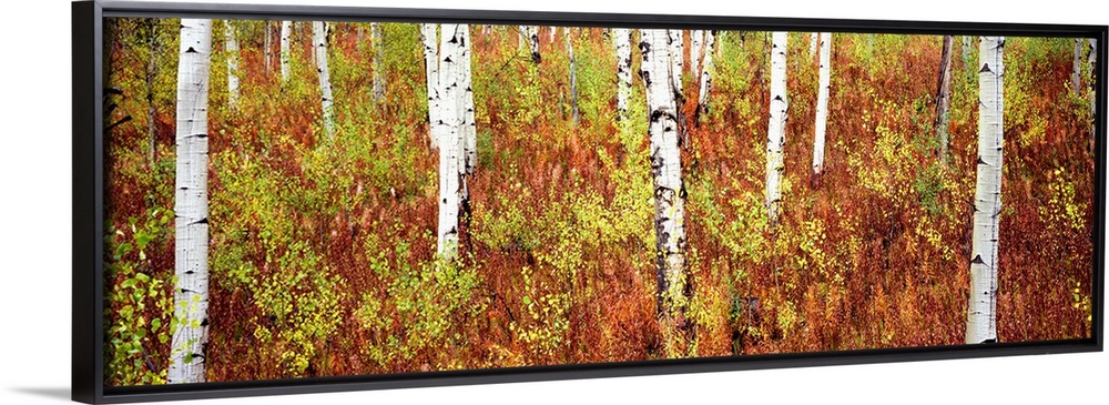 <p>Panoramic photograph of birch trees in forest surrounded by autumn foliage.</p>
