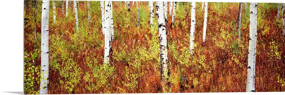 <p>Panoramic photograph of birch trees in forest surrounded by autumn foliage.</p>
