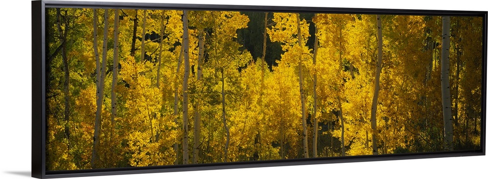 <p>Panoramic view of a forest full of bright leafy trees with thin trunks in a forest in the Rocky Mountains.</p>