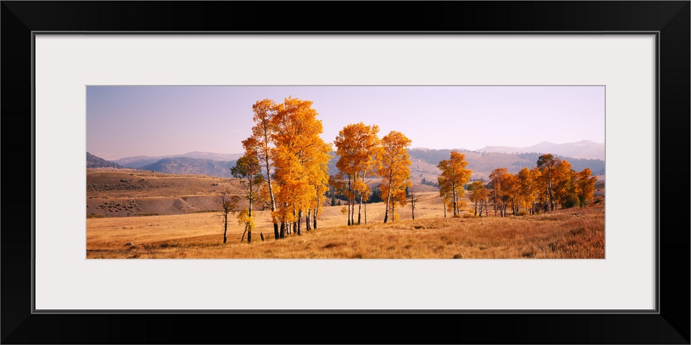 <p>Panoramic photograph taken of aspen trees that stand in line in a dry field. The leaves on the trees have turned orange.</p>