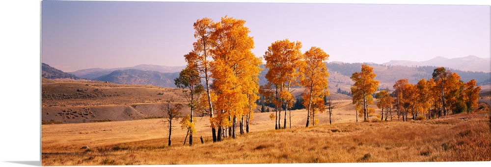 <p>Panoramic photograph taken of aspen trees that stand in line in a dry field. The leaves on the trees have turned orange.</p>
