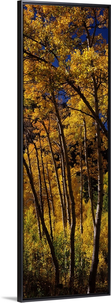 <p>Panoramic photograph displays a dense forest of tall skinny trees in the Western United States showing bright Fall colors on their leaves.</p>