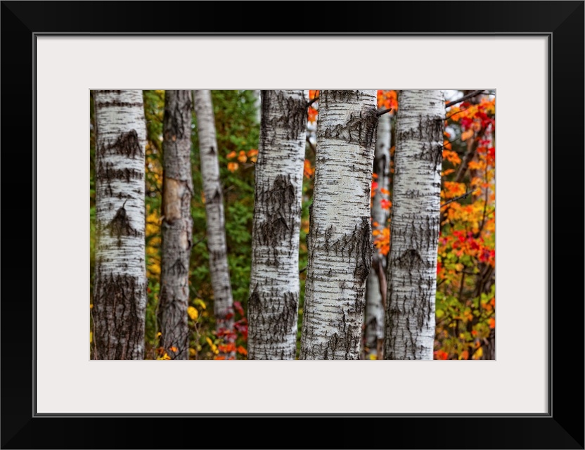 <p>Aspen Trees Surrounded By Colourful Autumn Leaves In Algonquin Provincial Park; Ontario Canada</p>