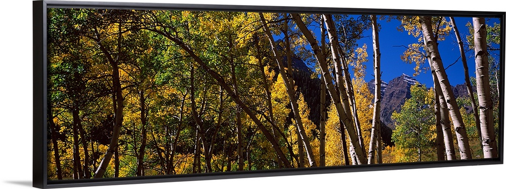 <p>Panoramic photograph on a large canvas of fall colored aspen trees in Pitkin County, Colorado. The Maroon Bells can be seen in the background against a deep blue sky.</p>