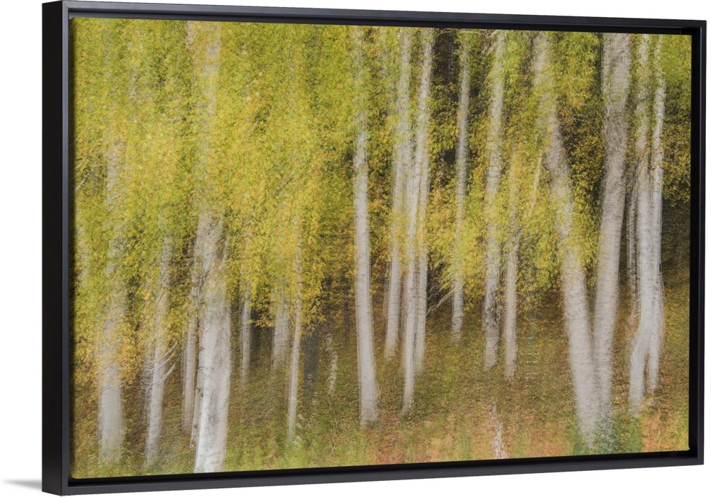 <p>Blurred motion image of slender aspen trees in the White Mountains of New Hampshire.</p>