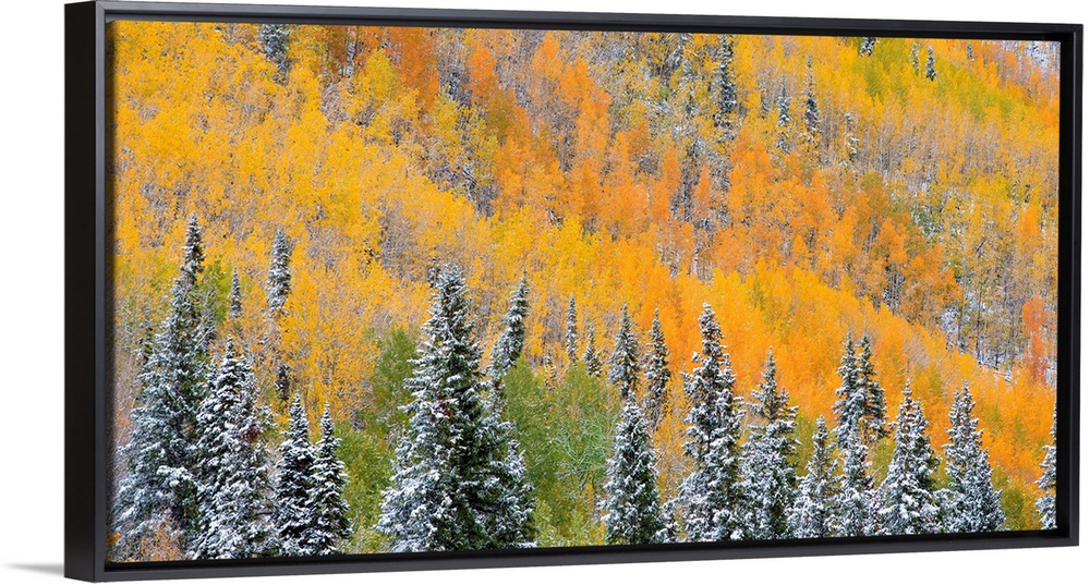 <p>A photograph of a sea of aspen and evergreens trees in fall foliage.</p>