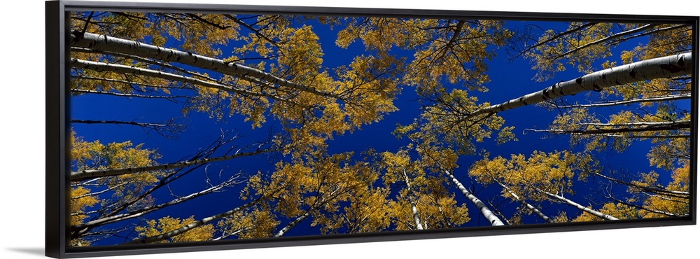 <p>The tall slender branches of trees stretch into the sky above in this panoramic photograph taken from below looking up into a canopy.</p>