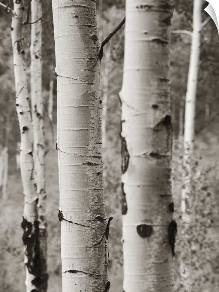 <p>A black and white photograph of a thicket of aspen trees.</p>