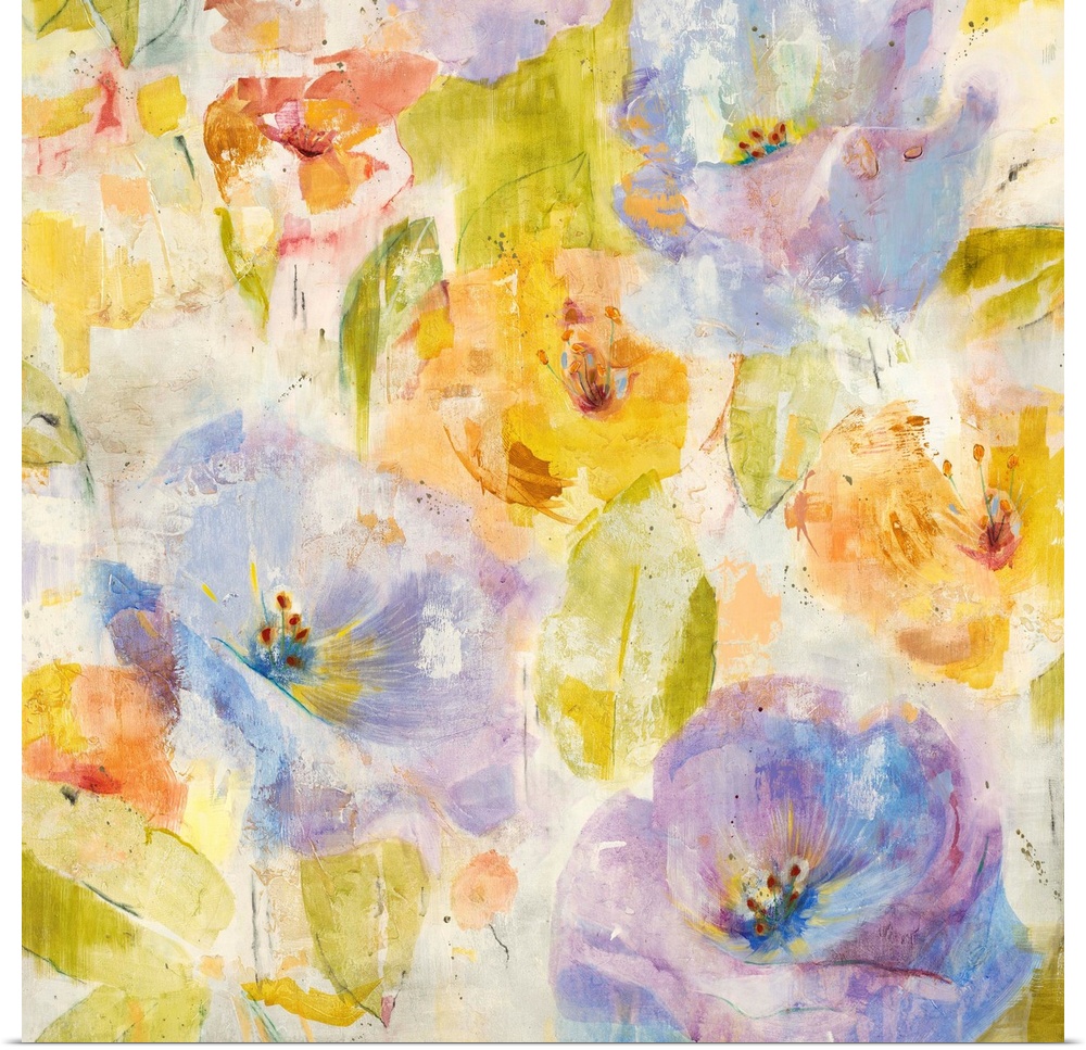 <p>A contemporary painting of soft pale purple and orange flowers.</p>