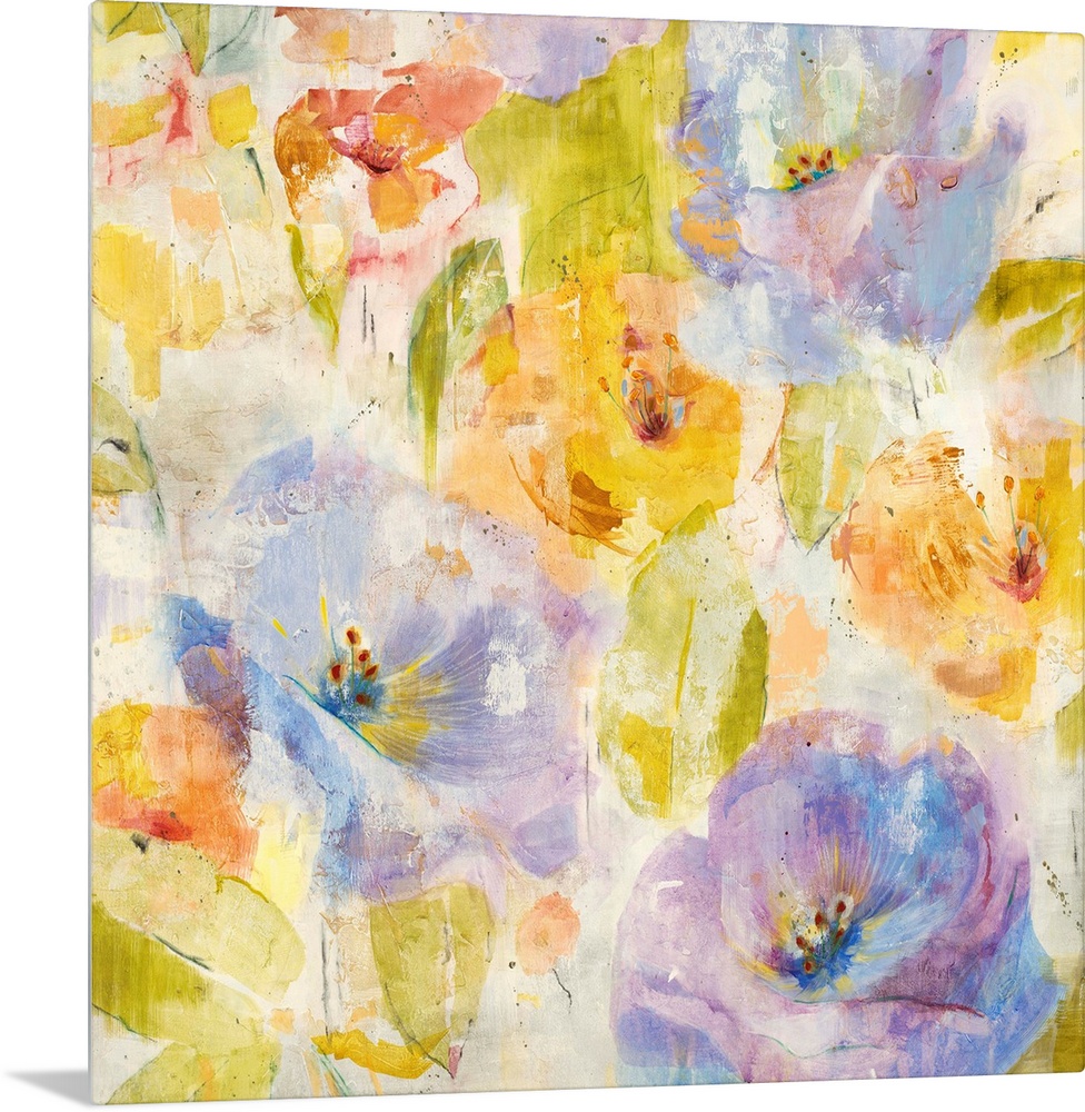 <p>A contemporary painting of soft pale purple and orange flowers.</p>